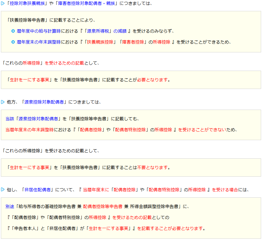 扶養控除等申告書の記載事項:「源泉控除対象配偶者」に係る「生計を一にする事実の記載が不要な理由」