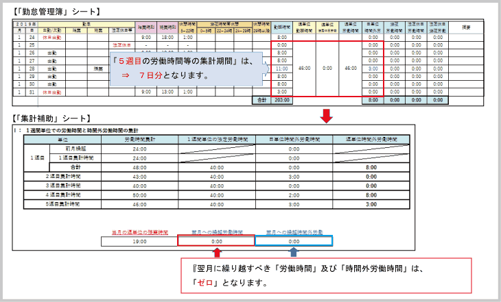 集補:繰5日目(31日) 2019年4月16日 サンプル勤怠管理簿(集計補助シート):繰越労働時間等の集計~勤怠管理簿(週5日目)&給与集計期間が31日の場合 「「集計補助」シートで行われる「自動計算の内容」」